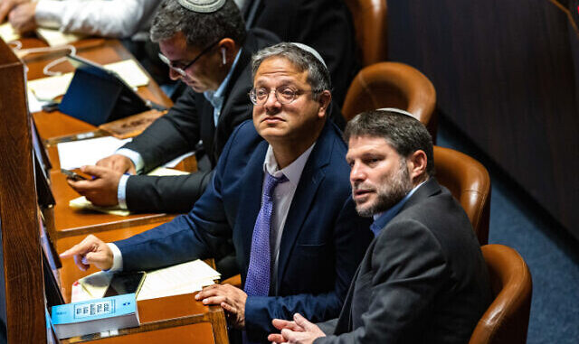 Religious Zionist party leader MK Bezalel Smotrich (right) with Otzma Yehudit party leader MK Itamar Ben Gvir in the Knesset plenum, December 28, 2022. (Olivier Fitoussi/Flash90)