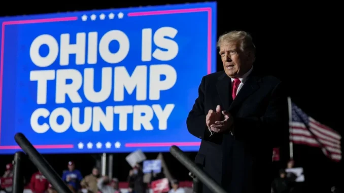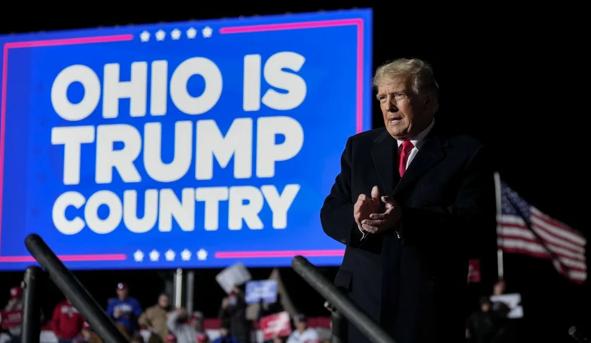 Former U.S. President Donald Trump speaks during a rally at the Dayton International Airport on Monday.Credit: Drew Angerer – AFP