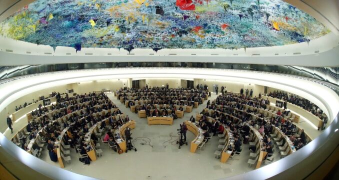 The Human Rights and Alliance of Civilizations Room of the Palace of Nations, in Geneva, Switzerland. The room is the meeting place of the United Nations Human Rights Council. Photo: Ludovic Courtès via Wikimedia Commons.