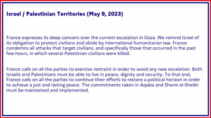 According to Haaretz, France’s Foreign Ministry said: “We remind Israel of its obligation to protect civilians and abide by international humanitarian law. France condemns all attacks that target civilians, and specifically, those that occurred in the past few hours, in which several Palestinian civilians were killed.”<