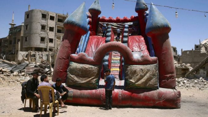 Children play inside an inflatable castle during Eid al-Fitr celebration in the rebel-held besieged Douma neighbourhood of Damascus, Syria June 26, 2017. REUTERS/Bassam Khabieh TPX IMAGES OF TH BASSAM KHABIEH/REUTERS