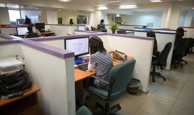 Illustrative: An ultra-Orthodox Jewish woman works on a computer at her desk in the Comax software company office in the central city of Holon near Tel Aviv on April 17, 2016. (AFP Photo/Menahem Kahana)