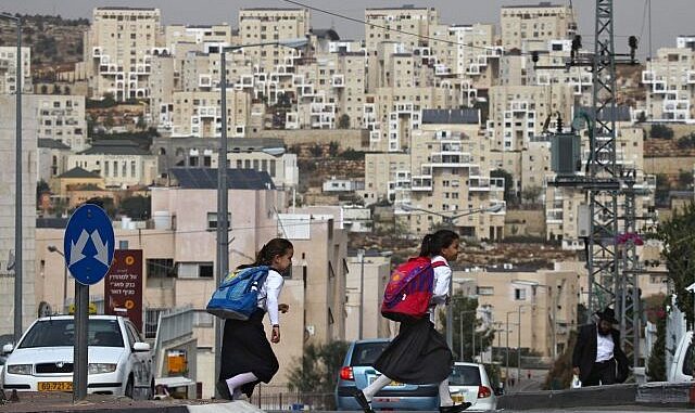 Illustrative: Ultra-Orthodox girls in Modiin Illit cross the street on their way to school, October 19, 2009. (Nati Shohat/Flash90)<