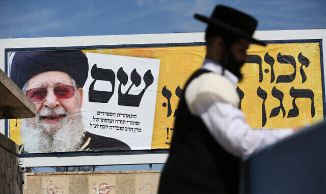 File: An ultra-Orthodox Jewish man walks near a billboard with a picture late Shas spiritual leader Rabbi Ovadia Yosef, as part of Shas election campaign, in the northern Israeli city of Safed, February 28, 2020. (David Cohen/Flash90)