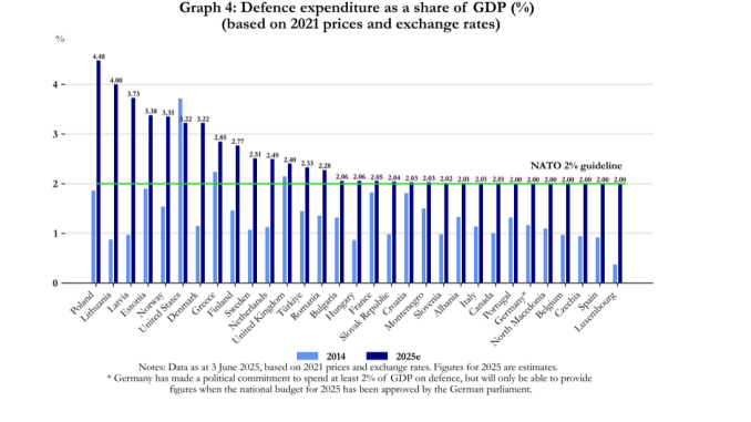 For a decade, the United States has been spending around 3 percent of its GDP on defense. According to a NATO report with data current as of June 2025, only two members — Poland and Lithuania — were estimated to spend 4 percent or more of GDP on defense this year.