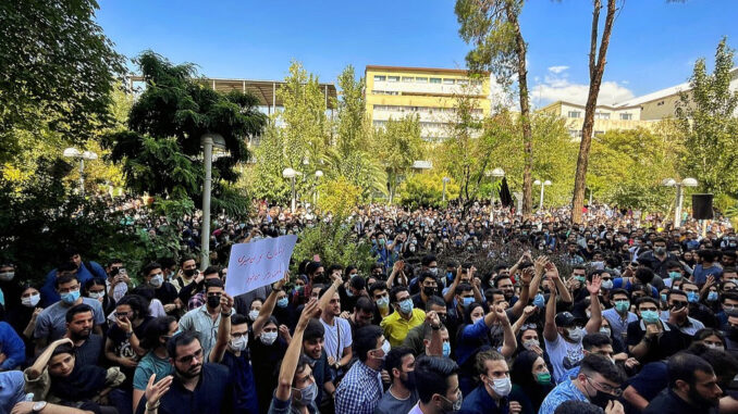The Biden administration appears to be repeating Obama administration’s policy of choosing to be silent in the face of the Iranian regime’s bloodshed, human rights violations, and crackdowns that kill and wound peaceful protesters. Pictured: An anti-regime protest at Amirkabir University in Tehran, Iran on September 20, 2022. (Image source: Darafsh/Wikimedia Commons)