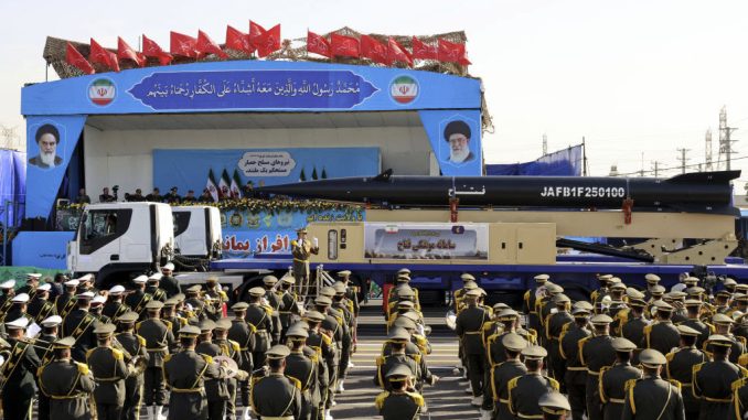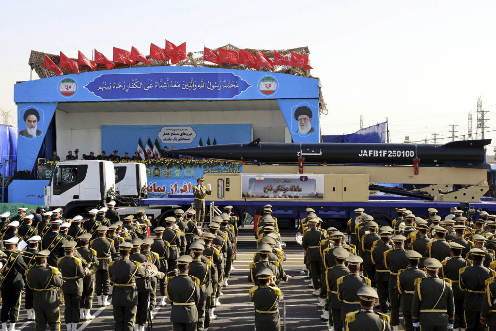Iran’s President Masoud Pezeshkian looks on from the dais, as a Fattah ballistic missile is displayed during at a military parade in Tehran on September 21, 2024. Fattah missiles were using in Iran’s October 1 attack on Israel. (Photo by Atta Kenare/AFP via Getty Images)