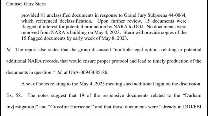 Despite extensive cooperation btw DOJ and NARA, the govt in May 2023 subpoenaed NARA for other documents. (Trying to figure this one out)