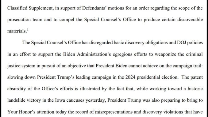 In the Special Counsel Jack Smith constructed Lawfare case against Donald Trump, what is generally called “the documents case”, involving the raid on Mar-a-Lago, President Trump’s attorney, Christopher Kise, did something similar to a speaking indictment with an extensive court motion on January 16, 2024. The 68-page motion is a comprehensive “speaking motion” which outlines a great deal of the fraud and Lawfare manipulation by the special counsel. [SEE DOCUMENT HERE]