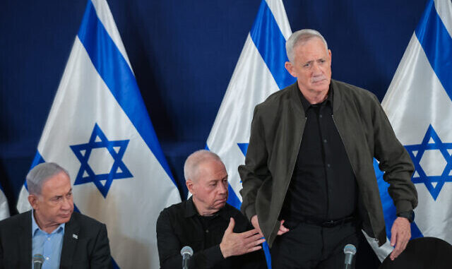 Prime Minister Benjamin Netanyahu, Minister of Defense Yoav Galant, and Minister Benny Gantz attend a press conference at the Ministry of Defense in Tel Aviv, December 16, 2023. (Noam Revkin Fenton/Flash90)