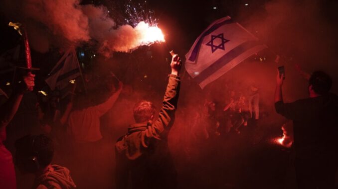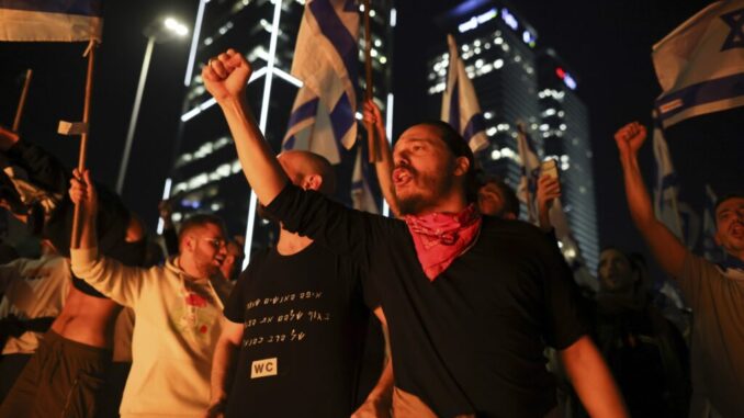 Israelis protest against plans by Prime Minister Benjamin Netanyahu’s government to overhaul the judicial system, in Tel Aviv, Israel, Thursday, March 9, 2023. (AP Photo/Oded Balilty)