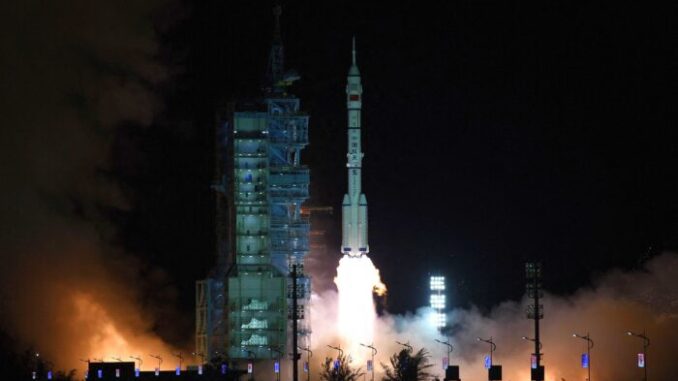 A Long March-2F carrier rocket, carrying the Shenzhou-13 spacecraft with the second crew of three astronauts to China’s new space station, lifts off from the Jiuquan Satellite Launch Centre in the Gobi desert in northwest China early on Oct. 16, 2021. (STR/AFP via Getty Images)