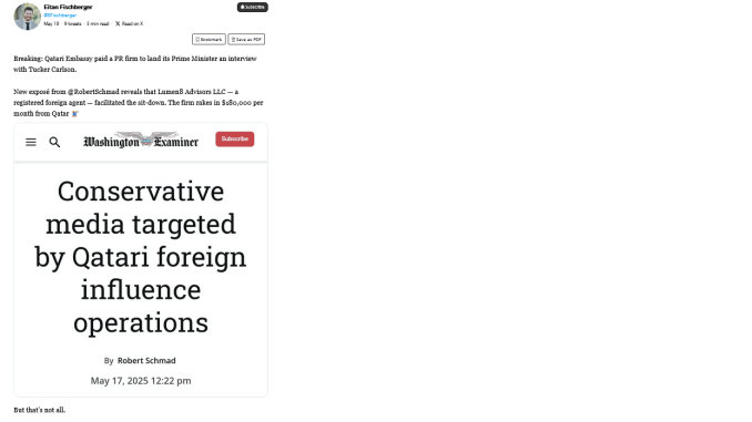 Peloni: The below Thread covers a report on a post-election Qatari foreign influence operation which targeted conservative news outlets following Trump’s election victory. The targets included Tucker Carlson, Fox News Digital, Just The News, the New York Post, the Daily Mail, and the Washington Examiner, with the Qatari PM’s interview with Tucker Carlson being described as “Perhaps Qatar’s biggest victory in its post-election right-wing media campaign thus far”. Notably, the report, written by Robert Schmad, was published on one of the targets of the Qatari influence efforts, the Washington Examiner.