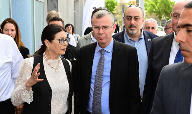 Supreme Court President Esther Hayut and Justice Minister Yariv Levin attend opening of a new courthouse in Katzrin on June 1, 2023. (Michael Giladi/Flash90)