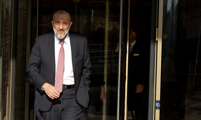 Shas chairman MK Aryeh Deri after coalition talks with Religious Zionist party head MK Bezalel Smotrich and Likud leader Benjamin Netanyahu outside a hotel in Jerusalem, December 5, 2022. (Yonatan Sindel/Flash90)