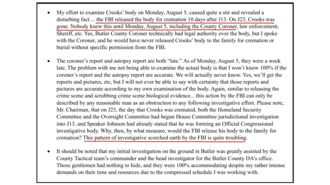 There are some remarkable revelations in the 6-page pdf. One detail outlines how it was a Butler County SWAT officer who fired the initial shot that stopped Matthew Crooks after 8 shots fired. The Feds did not initially stop the assassin, the locals did. Another detail highlights how the Butler County coroner was not aware the FBI quickly released the body of Crooks for immediate cremation.