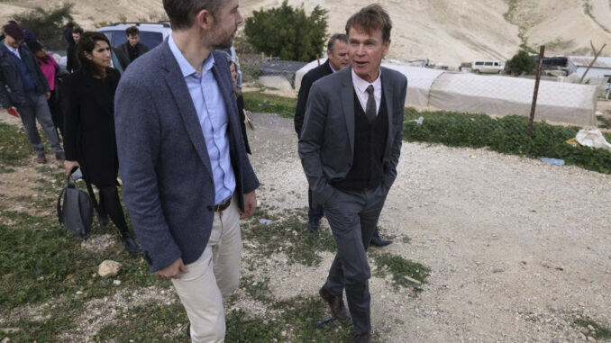 Head of the European Union’s mission to the West Bank and Gaza Strip Sven Kuhn von Burgsdorff (R) visits the illegally-built Palestinian community of Khan al-Ahmar near Jerusalem, on January 30, 2023. (Photo by Ahmad Gharabli/AFP via Getty Images)