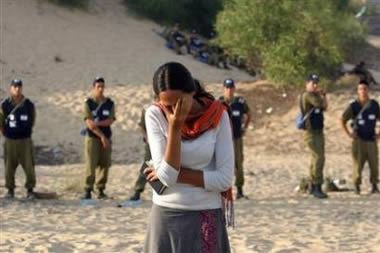 A Jewish woman weeps as Israeli soldiers surround the settlement of Neve Dekalim, in southern Gaza, on August 18, 2005, and prepare to move in. Even those Israelis who strongly backed the plan were greatly saddened to see Jews dragged from their homes. The leftist novelist David Grossman wrote in Ha’aretz: “These are days of mourning for all Israelis. We can mourn today for the passion, the pioneering spirit, the purposefulness that for years pulsed through Gush Katif and which will soon dissipate like smoke, and for the fabric of life there that will be shredded come tomorrow.”