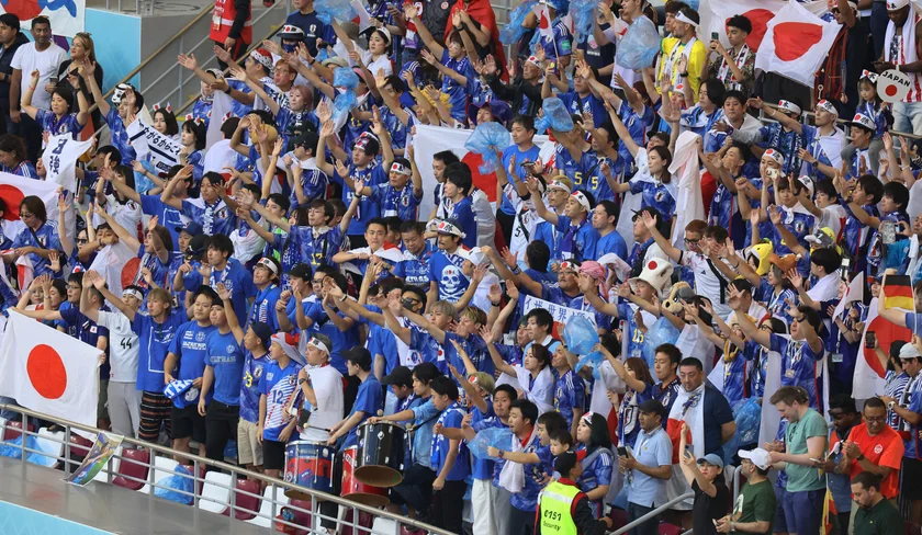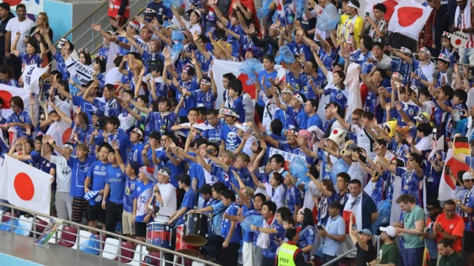 Japanese fans in Doha, Qatar, for their team’s game against Germany on Wednesday.Credit: Molly Darlington/Reuters