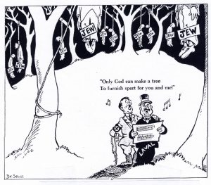In P.M., Seuss drew a cartoon showing Laval and Hitler, in a forest, singing the words of the famous poem “Trees,” by Alfred Joyce Kilmer. All around them, the corpses of dead French Jews hang from the trees. Seuss showed Laval and Hitler adding a line of their own to the poem, describing the murder of the Jews as “sport for you and me.”