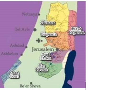 In the map below, the area above Jerusalem is Samaria and below is Judea – each divided into sub-regions. (Bik’at Hayarden is the Jordan Valley.)