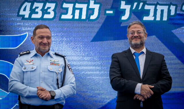 Police Commissioner Kobi Shabtai (left) and National Security Minister Itamar Ben Gvir at the Israel Police Independence Day ceremony at the National Headquarters of the Israel Police in Jerusalem, April 20, 2023. (Oren Ben Hakoon/Flash90)
