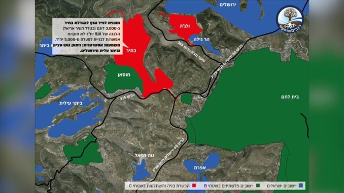 The package will include approval of hundreds of existing illegal structures, alongside territorial expansion of Arab settlements consisting of thousands of dunams. The Arab village of Batir, located between Jerusalem’s Gilo neighborhood and Gush Etzion, will be granted a permit for no less than 518 illegal structures as well as expansion of the village by some 3000 dunams – an area comparable in size to the city of Ariel. The plan will effectively cut off Gush Etzion from Jerusalem and severely compromise the security of the Gush Etzion-Jerusalem Tunnel Road.