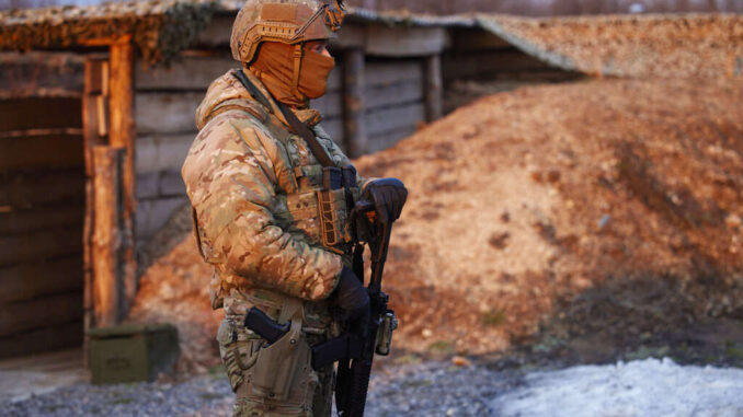 A Ukrainian soldier looks on at the front line in Donetsk region, eastern Ukraine, Thursday, Feb. 17, 2022 (AP via Ukrainian Presidential Press Office)
