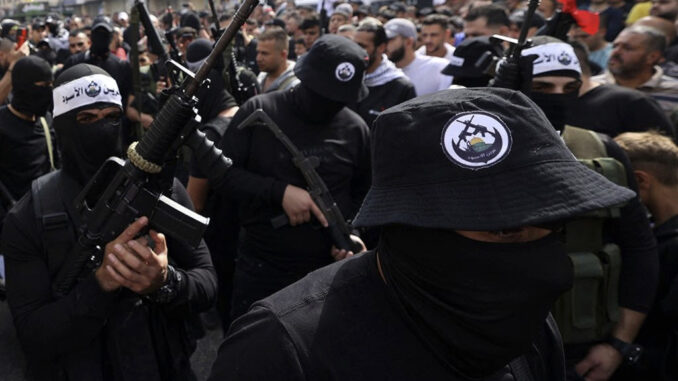 Pictured: Members of the Palestinian Lions’ Den terrorist group at a funeral in the city of Nablus on October 23, 2022. (Photo by Jaafar Ashtiyeh/AFP via Getty Images)