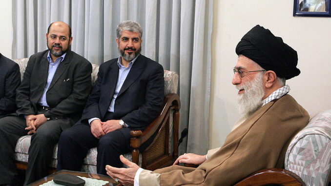 Iran provides roughly $100 million a year to Palestinian terrorist organizations such as Hamas and Palestinian Islamic Jihad, and $700 million a year to Hezbollah. Pictured: Iran’s “Supreme Leader” Ayatollah Ali Khamenei meets with Hamas leaders Khaled Mashaal (center) and Musa Abu Marzouk (left) in Tehran on February 1, 2009. (Photo by AFP via Getty Images)