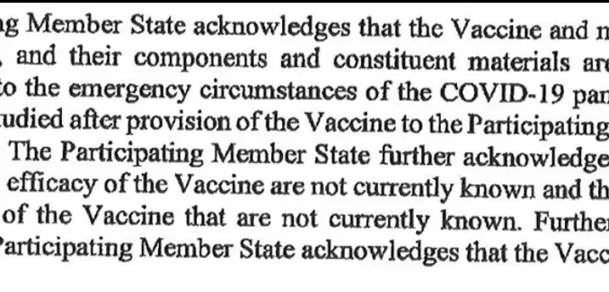 “The Participating Member State further acknowledges that the long-term effects and efficacy of the Vaccine are not currently known and that there may be adverse effects from the Vaccine that are not currently known.”