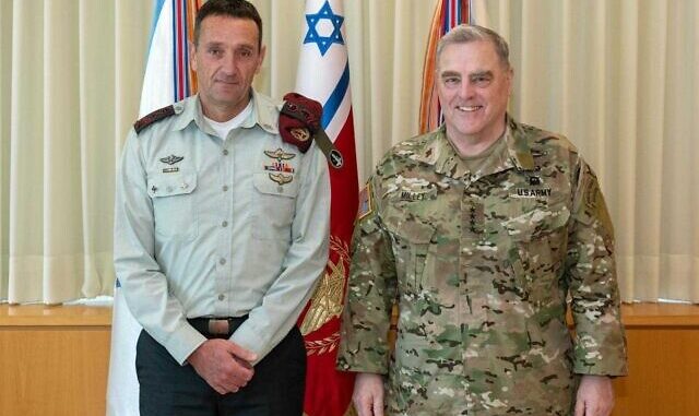 This handout photo from March 3, 2023, shows IDF Chief of Staff Herzi Halevi, left, meeting with visiting Gen. Mark Milley, the chairman of the US Joint Chiefs of Staff. (Israel Defense Forces)