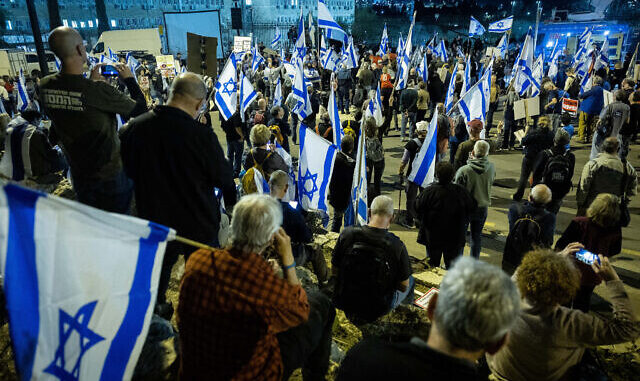 IDF reservists and activists protest against the government’s judicial overhaul, outside the Prime Ministers Office in Jerusalem, March 2, 2023. (Yonatan Sindel/Flash90)