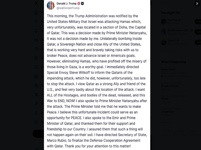 “I view Qatar as a strong Ally and friend of the U.S., and feel very badly about the location of the attack. I want ALL of the Hostages, and bodies of the dead, released, and this War to END, NOW!”