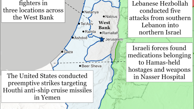 Note: CTP and ISW have refocused the update to cover the Israel-Hamas war. The new sections address developments in the Gaza Strip, the West Bank, Lebanon, and Syria, as well as noteworthy activity from Iran’s Axis of Resistance. We do not report in detail on war crimes because these activities are well-covered in Western media and do not directly affect the military operations we are assessing and forecasting. We utterly condemn violations of the laws of armed conflict and the Geneva Conventions and crimes against humanity even though we do not describe them in these reports.