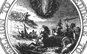• The first design for the official seal of the United States recommended by Benjamin Franklin, John Adams and Thomas in 1776 depicts the Jews crossing the Red Sea. The motto around the seal read: “Resistance to Tyrants is Obedience to God.”