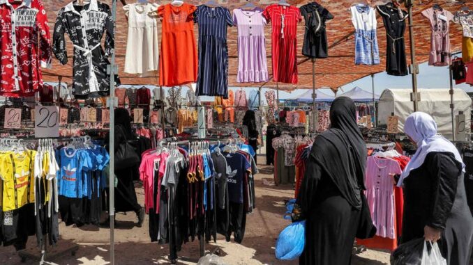 Women look at a clothing stall at an open-air market in the Bedouin town of Rahat in Israel’s southern Negev region, earlier this month.Credit: HAZEM BADER – AFP