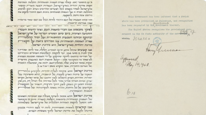 B. On May 14, 1948 a mere 11 minutes after Israel’s Declaration of Independence in a historic move, the United States, under President Harry S. Truman, officially recognized the provisional Jewish government as the de facto authority of the new State of Israel.