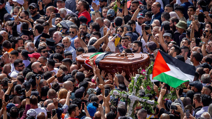 Over ten thousand Palestinians paid their respects to Abu Akleh — killed during a firefight early Wednesday between Israeli troops and Palestinian gunmen in Jenin — during the long, tense funeral procession that wound across the city from the Sheikh Jarrah neighborhood to the Mount Zion cemetery.