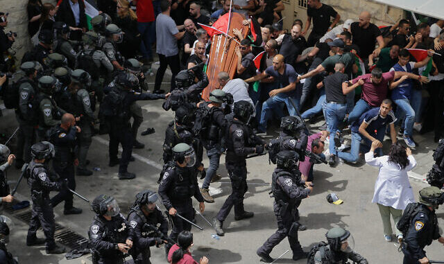 Israeli police confront mourners as they carry the casket of slain Al Jazeera journalist Shireen Abu Akleh during her funeral in Jerusalem, May 13, 2022. (AP Photo/Maya Levin)