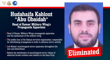 Israeli Defense Minister Israel Katz announced Sunday that the military eliminated Hudahaifa al Kahlout, better known as Abu Obeida, the previous day. Obeida was Hamas’s spokesperson and one of the group’s most recognizable figures.