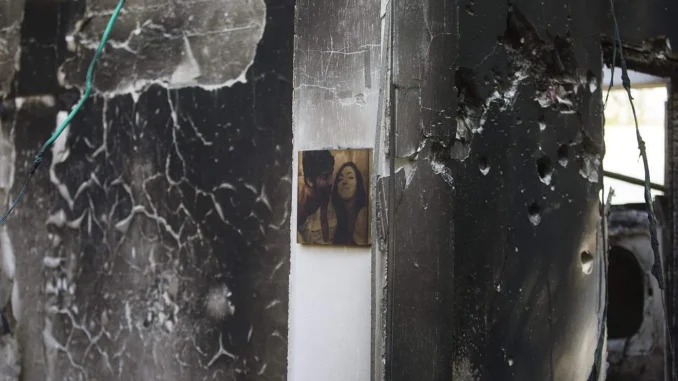 A photo of two Israelis in love survives on the wall of a home in Kfar Aza, where they were tortured to death by Hamas terrorists on October 7th, 2023. Photo: Rina Castelnuovo, JNS
