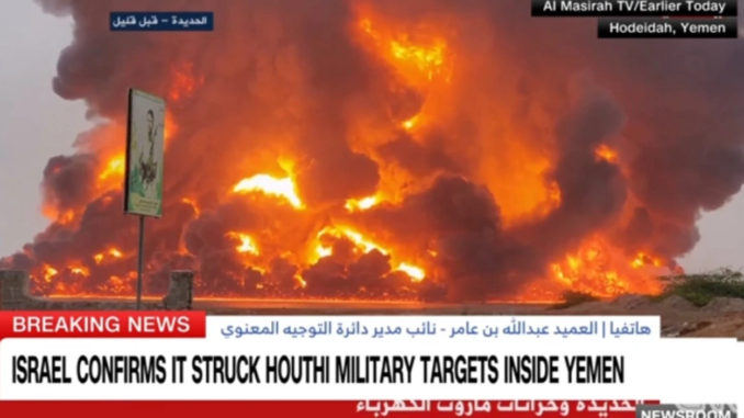 The Israeli Air Force struck a fuel depot in Houthi-controlled territory at the port of Hudaydah, Yemen on 20 July 2024. Al Masirah video via CNN.