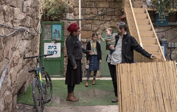 Itamar Leshem, right, with his wife, Chana, and children outside their home in Hebron. Credit…Avishag Shaar-Yashuv for The New York Times