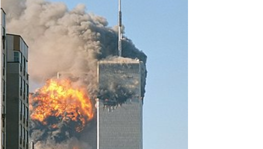 The northeast face of Two World Trade Center (south tower) after being struck by plane in the south face. Image is a cropped version of File:UA Flight 175 hits WTC south tower 9-11 edit.jpeg). Photo by Robert on Flickr – This image has been extracted from another file, CC BY-SA 2.0, Wikipedia [Cropped]
