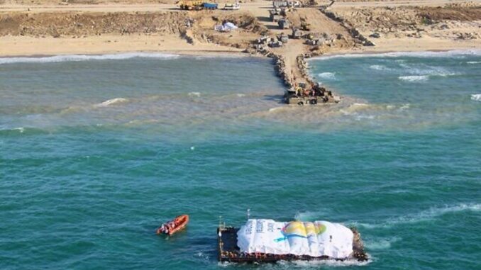 The first food delivery in March 2024 from World Central Kitchen in the Meals-on-Keels program, floating toward the jetty being newly constructed just south of the Gaza City Port. Image: IDF via Times of Israel.