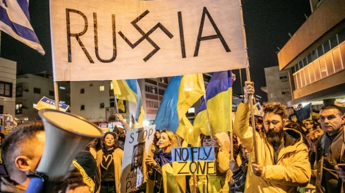 Protesters marching at a rally in support of Ukraine, in front of the Russian embassy in Tel Aviv, Israel Credit: Tomer Applebaum