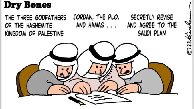 The Saudi Plan calls for Jordan, Gaza and part of Judea and Samaria (aka ‘West Bank’) to be merged into one territorial entity to be called the Hashemite Kingdom of Palestine.