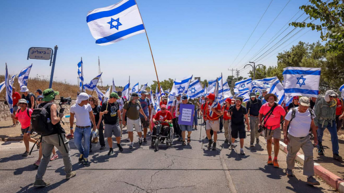 Anti-overhaul activists marching in Safed towards Rosh Pina as part of the protests against the Israeli government’s judicial overhaul, Sept. 7, 2023. Photo by David Cohen/Flash90.