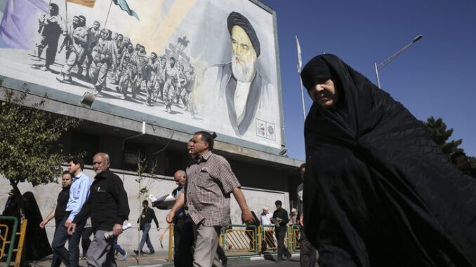 Iranian worshippers walk past a painting of the late revolutionary founder Ayatollah Khomeini and Basij paramilitary force members at the conclusion of a Friday prayer ceremony in Tehran on Oct. 13, 2017. (AP Photo/Vahid Salemi)